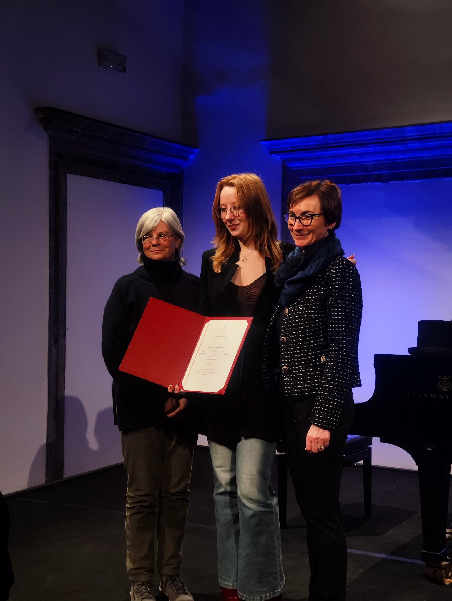 Alina Sofija Potisk iz 4. d za izvirno pesem Smrt in posebno omembo za izvirne pesmi z naslovi Zavist, Čas in Hrepenenje. Slovesne podelitve nagrad sta se udeležili tudi razredničarka 4. d Monica Caltran in Alinina mentorica Marjana Jus.