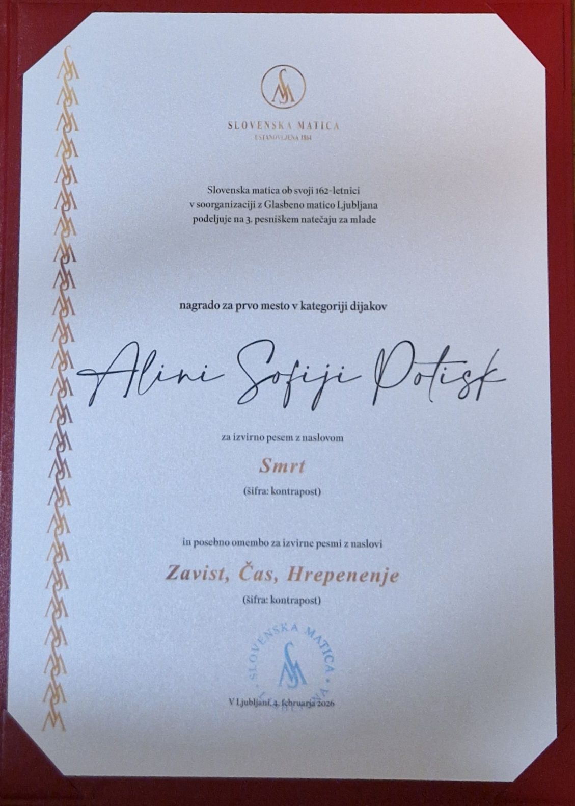 V sredo, 4. 2. 2026, je bila v Viteški dvorani Križank slovesna podelitev nagrad 3. pesniškega natečaja za mlade, ki ga je razpisala Slovenska matica v soorganizaciji z Glasbeno matico Ljubljana. Nagrado za prvo mesto v kategoriji dijakov je prejela